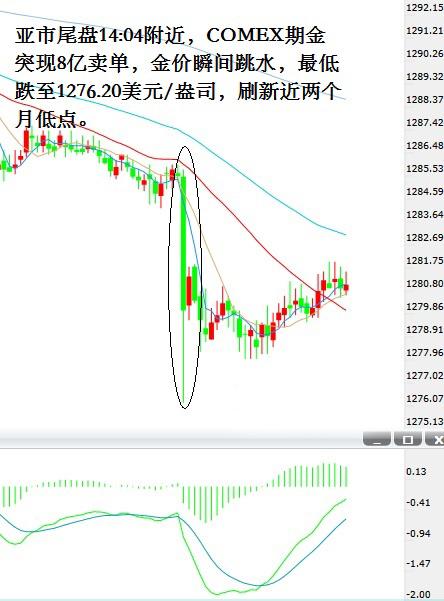 (來源:金融界網站) 週四(8月21日)亞市尾盤,美國黃金期貨主力12月合約市場突現6000手巨量拋單,總價值約8億美元,金價隨後在短時間內暴跌近12美元/盎司,1280關鍵支撐也一度失守。今天凌晨的美聯儲(FED) 會議紀要暗示可能會早於預期,這也令美元指數進一步走強,而現貨黃金則承壓走低。永豐金融集團(Wing Fung Financial Group)的研究負責人Mark To表示,“黃金受到美聯儲會議紀要打壓而走低,短期來看走勢依然疲軟。”