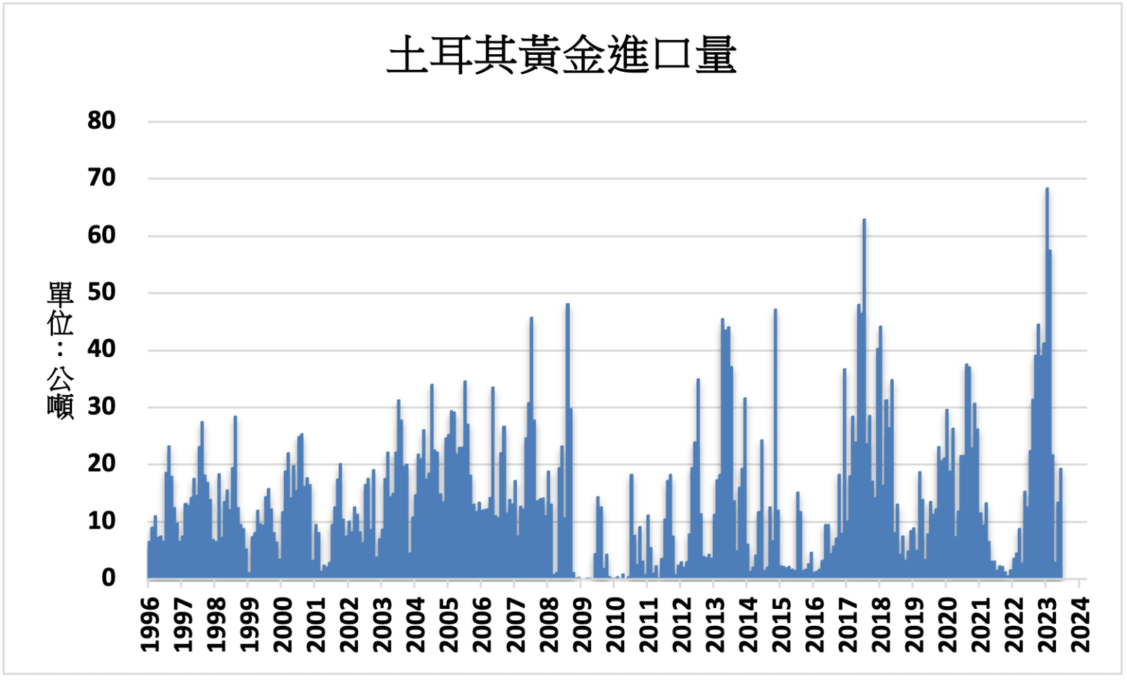 土耳其伊斯坦堡黃金交易所公布的數據顯示,2023年6月,土耳其黃金進口量較前月的13.4公噸增加至19.3公噸,相比1月份進口量為創下歷史新高的68.33公噸;累計今年上半年,土耳其黃金進口量年增233%至183公噸。瑞士海關的數據則顯示,2023年6月,瑞士對土耳其的黃金出口量較前月的9.4公噸增加至13.1公噸。