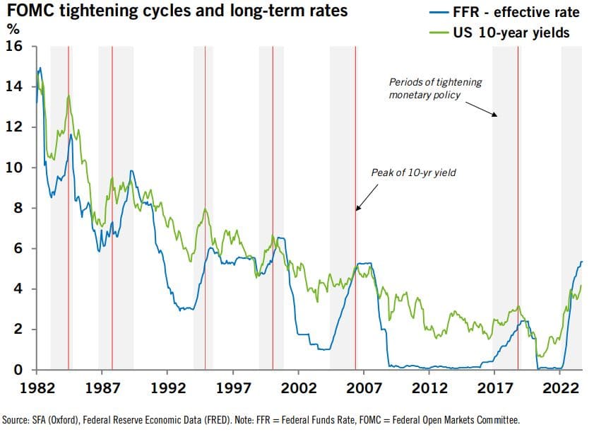 10年期殖利率見頂後,聯準會主席鮑威爾降低聯邦基金目標利率只是時間問題。該週期的最後一次升息也往往與10年期美國公債殖利率的高峰同時發生。自1984年以來,10年期美國國債的降息從未比10年期國債的峰值滯後超過一年零七個月——這是1989年的異常值。除1989年外,降息平均比峰值滯後約10個月。