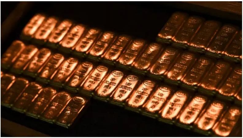 2023年9月15日,位於俄羅斯新西伯利亞的俄羅斯領先的黃金精煉和金條製造廠新西伯利亞精煉廠車間內放置的純度為99.99%的金錠。