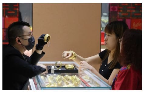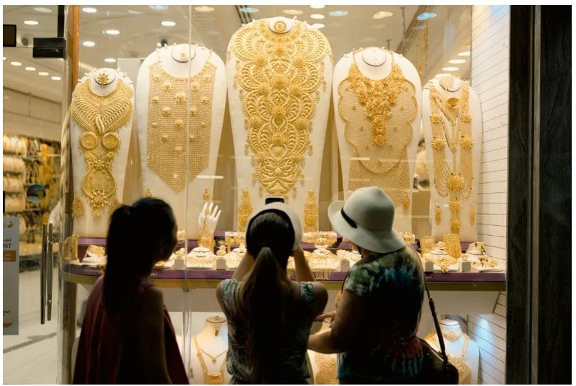 阿聯酋杜拜市,中國婦女正在觀看黃金珠寶。這種貴金屬具有優勢,因為它可以在世界任何地方的櫃檯上買賣。
