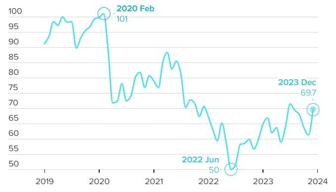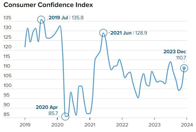 然而,來自密西根大學的密切關注的調查數據顯示,消費者信心雖然有所改善,但與疫情前的水平相去甚遠。12月的指數讀數顯示,市場情緒較去年同期改善了近 17%,但仍較2019年同月低了近30%。