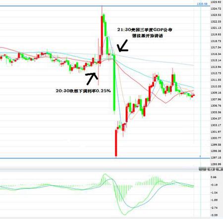 現貨黃金週四(11月7日)紐約時段盤初一度跌破1300美元關口,隨後逐步反彈至1310一線下方徘徊,因日內歐洲央行(ECB)央行意外下調指標再融資利率至0.25%,同時美國方面公佈了強勁的GDP數據,歐元/美元大幅跳水。隨後歐銀行長德拉基稱歐元區可能面臨較長時期的低通脹,中短期而言利空黃金。