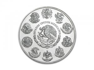 銀幣的反面圖案為墨西哥的雄鷹國徽,圖案為一隻嘴裡叼著蛇的雄鷹佇立在一棵從湖中岩石上長出的仙人掌上。據傳,阿茲台克人在神的啟示下在特斯科科湖的島上找到這個地方,並建立了特諾奇蒂特蘭城,日後發展為現今的墨西哥城。下方為象徵力量、忠誠及和平的橡樹和月桂樹枝。國徽周圍的文字為墨西哥的官方正式西班牙文名稱"Estados Unidos Mexicanos"。周圍則是有雄鷹叼蛇踩在仙人掌上,共有十種不同圖樣。雄鷹叼蛇被墨西哥人視為祖國的象徵,仙人掌則為墨西哥的國花。