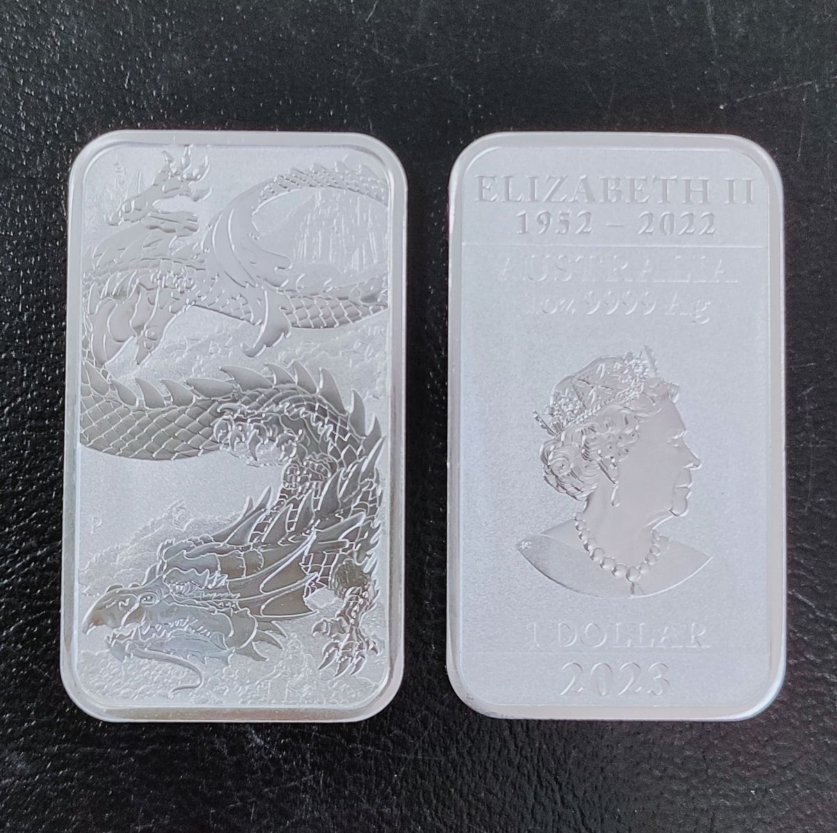 硬幣上刻有醒目的龍形象。在背景中,龍的寶庫包括寶箱和硬幣,以及來自古代文明的雕像和聖像。設計中包含珀斯鑄幣廠的“P”鑄幣標記。