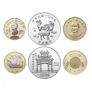 本紀念套幣採羊年銀幣壹枚,搭配中華民國104年版伍拾圓、貳拾圓精鑄幣各壹枚,合計三枚組合成套。